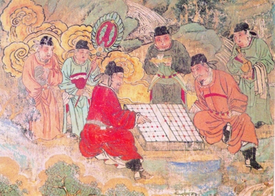 ▲山西洪洞水神庙元代壁画《弈棋图》(局部)。
