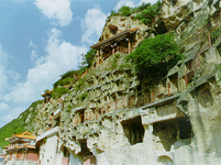 与千佛崖造像毗连的龙虎塔,是与四门塔齐名的著名古塔,因为塔门上雕刻有龙虎图案而得名。塔的建造年代没有确切的记载,根据建筑风格考证,应始建于唐代,补建于宋代。塔呈方形,高10.8米,砖石合砌而成。塔身雕刻有龙、虎、佛、力士、伎乐、飞天等浮雕,神态飘逸,气势不凡,人物造型颇具唐代的风格。塔的四面开辟有雕刻火焰纹的券门。三层石砌须弥座塔基上,装饰覆莲、伎乐、雄狮等浮雕。塔顶是砖砌而成的,重檐华拱,顶部饰有覆盆相轮状的塔刹。室内四壁雕刻有佛龛,龛额有飞天翱翔。正中是方形的塔心柱,每面雕有一尊佛像,突胸细腰,脸庞清秀,具有宋代的遗风。此塔素以造型优美,雕刻华丽而闻名。(国家文物局)