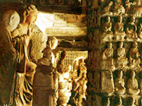 石窟中最大的是“万佛洞”,宽20米,深14米,高7米。窟内的正中有东西长11.5米、南北宽5米、高2.5米的佛坛,坛上立有八根方形的石柱,上承窟顶。窟顶是莲花纹的藻井。佛坛上下有16尊高2~3米的圆雕佛像,可分为三组,都是释迦牟尼及其弟子、菩萨的造像。窟壁和八根石柱上还遍布有大小佛像一万多尊,这些佛像各具神态,体态丰润,雕刻手法以写实为主,刀法细腻,给人耳目一新的感觉,是北宋雕刻艺术的代表作品。(国家文物局)