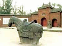 步行出寺院向东行15米,郁郁葱葱的林荫深处掩映一塔,巍然耸立,高入云端,名为齐云塔,又称释迦舍利塔。塔高25米,方形,十三层,始建于金代大定十五年(1175年),也是洛阳现存较早的古建筑之一。寺门的外边对立着两匹宋代雕刻的青石马。