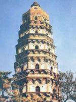 苏州云岩寺塔又称“虎丘塔”,是古城苏州的象征。云岩寺的所在地原来是晋司徒王珣和其弟王珉的别墅,先在山下,后来塌毁后移至山上并合而为一。宋至道年间(995~997年)寺院又遭毁弃,大中祥苻年间(1008~1016年)重建,并改称“云岩禅寺”。塔随其名,始建于五代后周显德六年(959年),建成于北宋建隆二年(961年),根据文献的记载,云岩寺塔曾多次被焚,焚后也是屡加修葺,始有今日的规模。