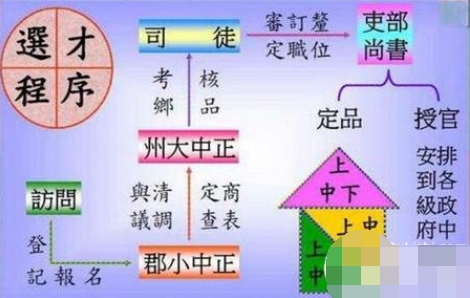 其法为,州郡设置中正官,择贤良有识之士担任,负责考察本州本郡士人,不计门第,但论德才,然后写成“状”(即评语),定为上上、上中、上下、中上、中中、中下、下上、下中、下下九品,政府择人按“状”任用。中正官有权进退,“其言行修著者,则升进之,或以五升四,以六升五,倘或道义有亏缺,则降下之,或自五退六,自六退七”(《魏志?陈群传》)。