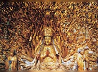 千手观音龛镌刻于大佛湾南崖东头的岩壁上,刻手1007只,纵横交错,富于变化,画面如同孔雀开屏一般,金碧辉煌、富丽多姿,是国内仅有的一尊。华严三圣像高7米,菩萨手托千斤石塔,历经多年而不坠毁,可见其建造时力学运用之高妙。宝顶圆觉洞,在大佛湾的南岩,以设计周密及雕刻精美而著称于世。洞顶的上方开天窗用以采光,洞口开有两道。洞顶的泉水引入洞中后经壁间的小沟流入龙口吐出,再注入暗沟流出洞外。洞的正壁刻有三尊佛像,主佛前有一尊跪菩萨,俯首合十,显得十分的恭敬虔诚。左右壁为十二圆觉菩萨,趺坐莲台,美丽庄严,姿态不一。壁间雕刻楼台亭阁、人物鸟兽、花草树木、幽泉怪石,与写实作品十分相近,是大佛湾雕刻的精华之作。