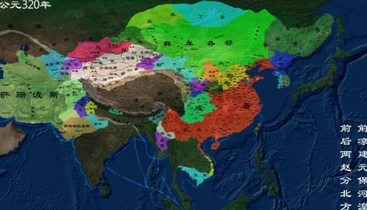 公元317年,刘渊灭西晋。晋政权东迁至南京,史称东晋。随后的时期,中国北方便陷入战乱之中,匈奴、鲜卑、羯、羌、氐等五个主要少数民族粉墨登场,先后建立了二十多个政权,其中有十六个实力相对强大,所以又称五胡十六国时期。