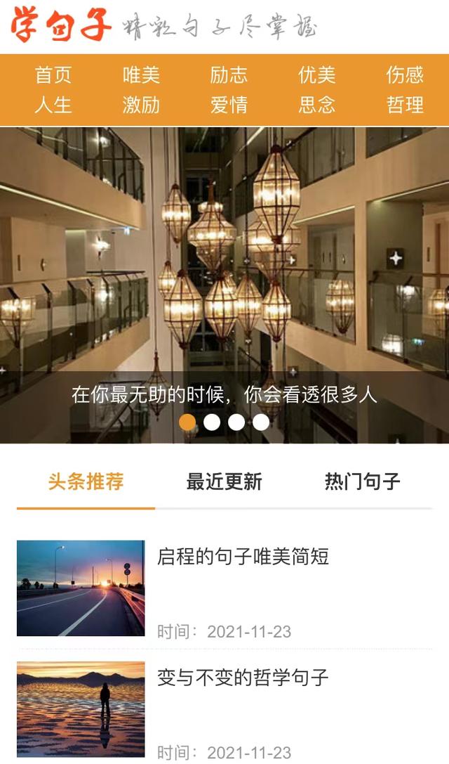 学句子网站整合了当下最热门的文案,并进行整理分类。类目有:经典、说说、唯美、励志、伤感、人生、激励等。内容以文章的形式展现,每篇文章都会整理10-50条短文案。