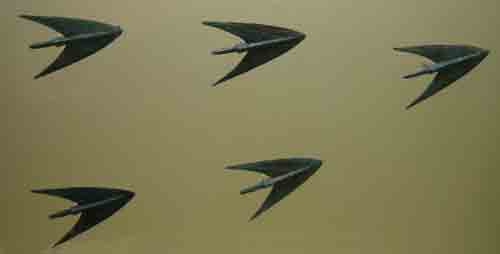 带平衡翅的青铜箭镞,后掠的尾翅使射出的箭飞行稳定,其功能与现代导弹的尾翼相似,商代后期(约公元前1100年),江西省新干县出土(存江西省文物考古所)