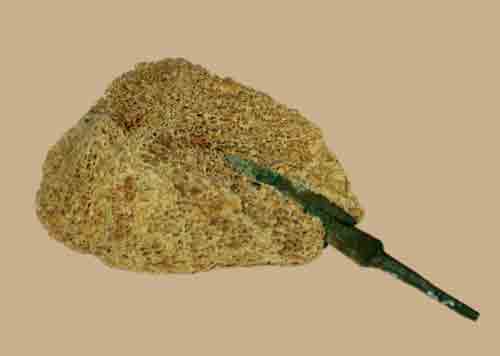 一枚春秋战国时期的青铜箭镞,至今牢固地嵌在当时遇害者骨骼中,北京地区出土(存首都博物馆)