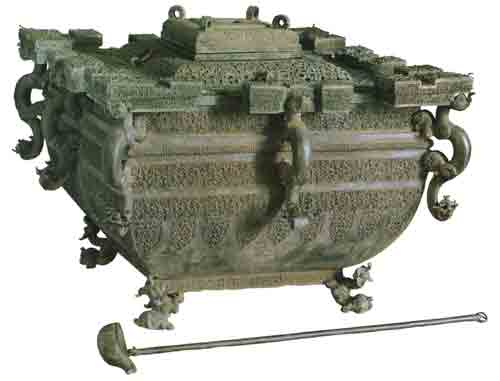 战国时期的青铜鉴缶,中央是盛酒的容器,缶的外壁和酒器之间放冰,是世界上最早的冰箱。湖北省随州市擂鼓墩出土(存湖北省博物馆)