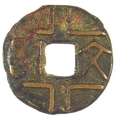 “文信”青铜方孔圆钱,吕不韦担任秦国丞相时所铸,因吕不韦被封为文信侯,钱上书大篆体“文信”二字。这种设计便于批量制造金属货币。公元前三世纪(存辽宁省博物馆)