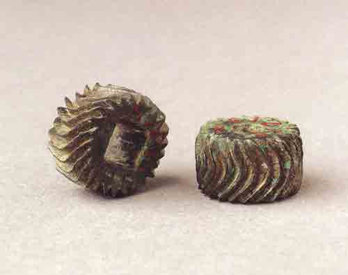 西汉的铜齿轮,采用这种奇异的齿形,可以传送巨大的力量,带动复杂的机械装置。高0.9厘米,外径1.5厘米,陕西长安洪庆村出土(存中国国家博物馆)