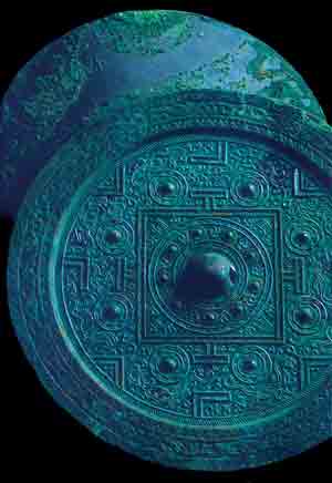 带“六博”图案的青铜镜,这枚铜镜的背面纹饰有四组对称的直角形、丁字形和曲尺形图案,有标识东西南北方位的动物图案,是中国古代称为“六博”的棋盘。今天人们一直不知道这种棋的对弈方法。早在公元前141年,陕西咸阳汉景帝陵出土(存陕西汉阳陵博物馆)