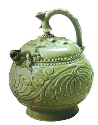 耀州窑青釉提梁倒灌壶,没有壶盖和上口,从底部注水,构思奇特。高18.3厘米,宋代,陕西省西安市出土(存陕西省博物馆)