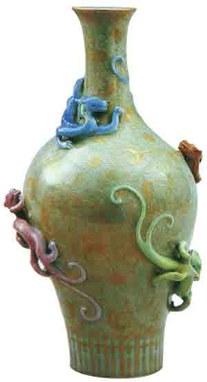 粉彩描金堆贴蟠螭纹瓶,以淡青釉为地,金粉描绘花卉图案,腹部堆塑四条动态各异的神秘动物,这件艺术品汇集了陶瓷技术的多项发明。高29.5厘米,清乾隆时期(存故宫博物院)