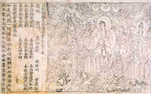 雕版印本《金刚经》首卷插图,此印本是世界上最早印制的书,印于公元868年,1900年在甘肃敦煌千佛洞发现(存伦敦大英博物馆)