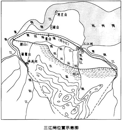 古代的山阴,会稽,萧山三县地势低下,上承千山万壑的水,一遇淫雨连绵,山洪瀑发,泄水不畅,淹没农田庐舍,又因钱塘江水位较高,每年八月大汛,怒潮似排山倒诲,狂澜倒灌,无数良田沦为沧海,待到潮退水落,留下一片茫茫荒野。为了阻挡钱塘海潮的侵袭,古代劳动人民便在萧、绍两县的东,北筑起海塘.从马溪桥至西兴一段称“西江塘”,再从西兴至宋家漤一段称“北海塘”,由宋家漤至高坝一段称:“东江塘”。沿塘共建立二十几处水闸。但由于钱塘江潮猛水急,流沙严重,闸基不稳,这些水利设施往往不能很好的发挥作用。
