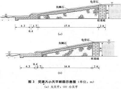 灵渠渠首处用拦河坝壅高湘江水位,将其一股(今称南渠)通过穿越分水岭的人工渠道引入漓江上源支流,并对天然河道进行扩挖和整治后,入漓江;将另一股(今称北渠)另开新渠屈曲于湘江右岸再入湘江。用拦河大小天平、用条石砌的溢流坝,、铧嘴(导水分水堤)、湘江故道和泄水天平,综合地实现了分水、引水和泄洪等项功能。渠道由人工渠、开挖天然溪流的半人工渠道和整治后的天然河流组成,南渠长33km,北渠长3.5km。以弯道减缓坡度;以陡门和堰坝节制用水,增加通航水深;以侧向溢流堰分泄洪水,保障安全。唐代已建有陡门18座,宋代发展到36座,元明清三代多次维修完善,保证了灵渠航运长期不衰,对广东广西地区的政治、经济、文化有重大影响。1936年和1941年,粤汉铁路和湘桂铁路相继通车,灵渠的航运逐渐停止。中华人民共和国成立后,对灵渠全面整修,基本保留了传统工程面貌,使其成为灌溉、城市供水和风景游览综合利用的水利工程,已无通航效益 。