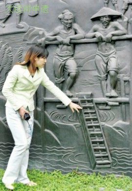运河博物馆外墙有一幅大型浮雕,这幅浮雕讲述的是古代运河两岸的人家利用运河水来灌溉农田,画面上有两个人正在踩水车。