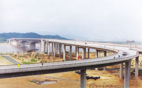 引桥0#~6#墩上部结构为6孔32m混凝土T梁,公路分设两侧,每侧每孔4片。下部为公铁共用墩;矩形截面墩身。正桥(0#~3#墩)上部结构为123.6m+170m+123.6m预应力混凝土连续刚构,其横截面为单箱、双室、斜腹板式。桥面总宽28。2m,铁路居中,单线宽7。2m,两侧为公路,各宽8。5m,公路外侧为宽2m的人行道和护栏,箱内预设2φ1。0m过水管道;箱梁底板位于R=514m的圆周上,宽度由近墩处的12m渐变至跨中16m。全桥载重相当于二十个车道的汽车荷载,由中铁大桥局承建。