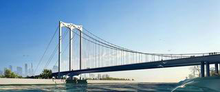由中铁大桥局承建。平胜大桥主桥是佛山市和顺至北滘公路主干线工程的重要工程,主桥为具有世界先进水平和难度的独塔单跨自锚式悬索桥;南岸主塔墩置于南岸河堤坡脚外侧边缘,北岸边墩跨越北河堤和沿江大道后布置在沿江大道路基边坡上,主桥按双幅(单幅宽26.1m)设置,由北往南孔跨布置为:(29.6+30+350+30+5×40+39.6)m,全长680.2m,悬索桥主跨350 m。