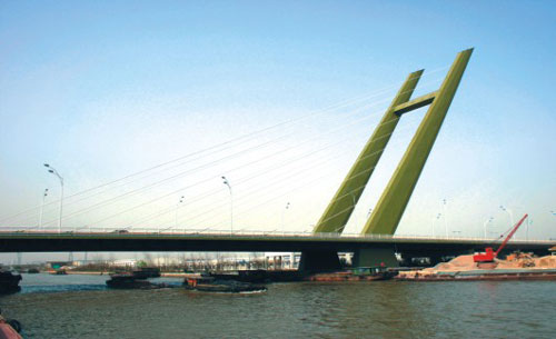 为门式独斜塔无背索斜拉桥,跨径100+35m,桥宽37m。主梁采用全伸臂吊装法施工,主塔箱内随主梁施工分期填充混凝土,以平衡主梁体重量,为该桥施工的一大特色。由中铁大桥局承建。