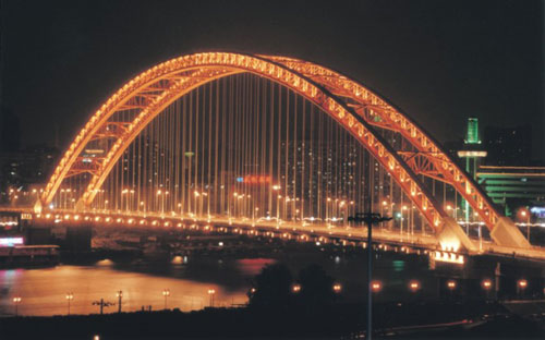 长沙黑石铺湘江大桥2000-2003 由中铁大桥局承建。大桥全长3360m,其桥跨布置为:12×30m(混凝土连续箱梁)+5×80m(上承式混凝土箱肋拱)+144m+162m+144m(中承式钢管混凝土拱)+3×80m(上承式混凝土箱肋拱)+9×30m(混凝土连续箱梁),主桥由中间11孔拱桥形成连拱体系。..