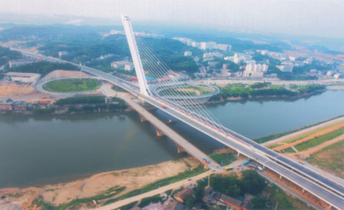 由中铁大桥局承建。位于长沙市北二环线,主桥为无背索斜塔斜拉桥,主跨206m,是世界上最大跨度的竖琴式无背索斜拉桥。