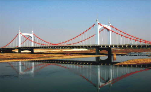 沈阳富民桥2002.4-2003.12 由中铁大桥局承建。大桥全长602m。主桥为单索面折线型双塔斜拉桥,长420m,主塔为折线型斜塔,梁顶以上塔高67.5m,主塔采用箱型截面,底部节段中心偏角14.6209°,上部变为7.1208°。荣获中国建筑工程鲁班奖。..