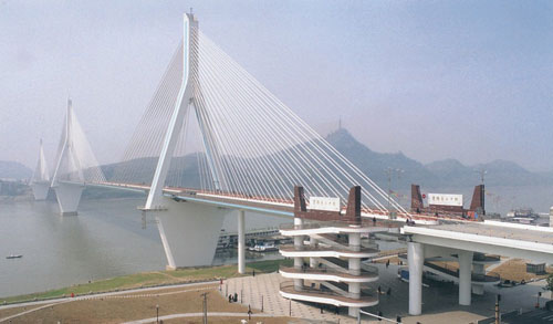 宜昌夷陵长江大桥(以下简称夷陵大桥)位于宜昌市繁华市区,该桥结合桥址区航道具体情况,大胆创新,首次提出三塔单索面斜拉桥方案,造型新颖独特,斜拉桥跨径布置为(120+348+348+120)米,桥面宽度23米。其2×348米的主跨为国内第一,同类型桥梁中亦属世界前位。桥跨布置为边跨(38.0+38.5+43.5)+2x主跨348.0+边跨(43.5+38.5+38.0)=边跨120.0+2x主跨348.0+边跨120.0=主桥936.0m,对中塔呈对称布置。