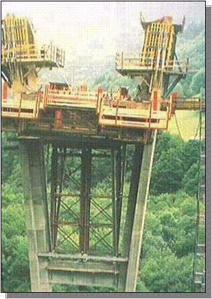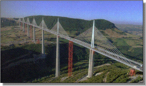 法国塔恩河谷处的米约桥,是世界上一座名桥。全长2.5km,具有8个单索面的连续钢斜拉桥。跨径204m+6×342m+204m。此桥的混凝土桥墩最高的达245m,另加塔高89m。是世界上最高的多塔斜拉桥。采用顶推进法施工,由两侧相对进行。此桥已于2005年建成通车。