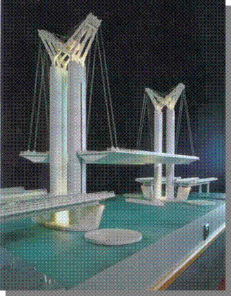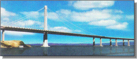 美国旧金山的奥克兰大桥在地震后正在修建一座新的奥克兰大桥(New Oakland Bay Bridge)。它是一座跨度为385m的自锚式悬索桥。其施工方法及造型可供我们借鉴。
