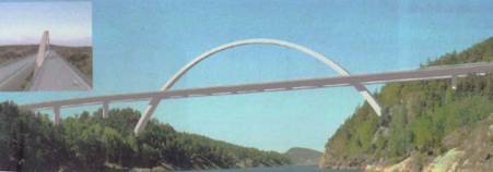 在瑞典—挪威国界间的斯温桑德桥(Svinesund)是一座混凝土单肋拱桥。其两侧为钢箱梁,是目前世界最大的单肋拱桥。跨度为247m,2004年建成。