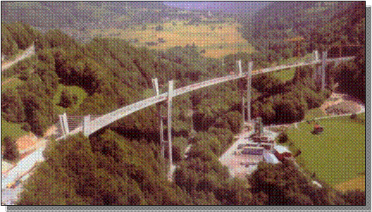 瑞士的桑尼勃格桥(Snniberg)是一座在深谷中修建的曲线型预应力混凝土矮塔斜拉桥,它的优美造型为世人称赞。跨度140m,1998年建成。