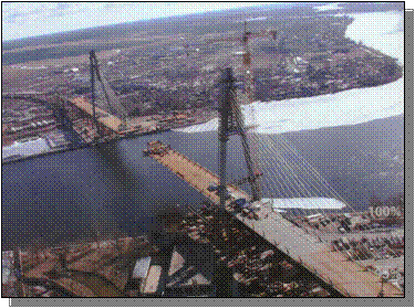俄罗斯的圣彼得堡市,正在修建一座钢斜拉桥在2004年夏季已完成了孪桥的一半,另一半还未修建。