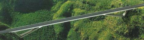 是一座有钢管桁梁加劲的悬带桥。这种桥型适合用在人行桥上,跨度90m。
