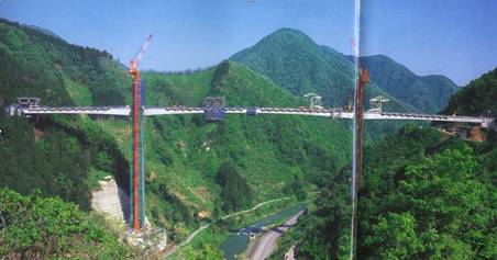 是一座矮塔PC斜拉桥。在山谷中造型美观,跨度220m,下图是正在施工中的情景。