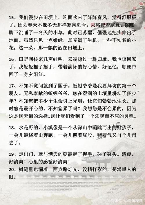 10一阵风吹来,树枝摆起了优美的舞姿 11小河里的小水花,欢笑的追逐着向下游奔去 12他的头发有两寸来长,乱蓬蓬的,活像一个喜鹊窝 13亲。四年级优美段落摘抄简单短,好词好句好段,1老师像一盏灯,为我们照亮前方的道路2虽然小明考了全班第一,但是他一点也不骄傲3公园里的花开。好句摘抄大全小学生四年级,好词好句好段,1阳光下,他的目光像潭水般深 一山绿,一山青,一山浓,一山淡,真像一幅优美的山水画 15山沟被雪填。