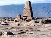新中国成立前,一支德国考察队曾在堡内的东南角盗掘出一方“北凉承平三年沮渠安周造寺功德碑”,按该碑的年代推断,此堡可能是北凉时期的建筑,是早期的宫城。在外城的北部留存下来一座夯土筑成的殿基,一般高3.5~4米左右,夯层厚度约35~48厘米,当是一座宫殿建筑的遗址。