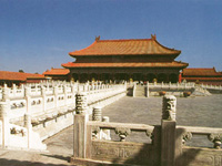 故宫的宫殿分前后两个大的部分,前为外朝,后为内朝,建筑风格也迥然不同。外朝是皇帝举行登基等大典、召见群臣商议国事、行使国家大权的场所。午门是外朝的开端,城墙上建庑殿式重檐大殿左右伸延,形成五座城楼,俗称五凤楼,一到午门前就让人不自觉地产生一种非常森严的感觉。前行进午门豁然开朗,正北就是高大宏伟、让人觉得不可逾越的太和殿。首先是内金水桥,桥栏上雕琢精美,形似玉带,过了金水桥以北即是以太和、中和、保和三大殿为中心,文华、武英两殿为两翼的外朝主体建筑群。