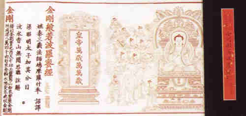 这部《金刚经》长约一丈六尺,高约一尺,是由七个印张粘连而成的卷子。卷首有一幅画,上面画着释迦牟尼对他的弟子说法的神话故事,神态生动,后面是《金刚经》的全文。卷未有一行文字,说明是咸通九年刻印的。
