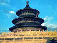 天坛的主体建筑是祈年殿,每年皇帝都在这里举行祭天仪式,祈祷风调雨顺、五谷丰登。祈年殿呈圆形,直径32米,高38米,是三重檐亭式圆殿,宝顶鎏金,碧蓝琉璃瓦盖顶;殿内九龙藻井极其精致,富丽堂皇,光彩夺目;大殿结构十分独特,不用大梁和长檩,檐顶以柱和枋桷承重,中央的四柱高19.2米,代表一年中的四季,外围两排各有十二根柱子,分别代表十二月和十二时辰。大殿建于高6米的三层汉白玉石台上,游人立于其下,顿能觉到大殿仿佛高耸云端,巍峨气势顿现。若再拾阶登临坛台,极目远眺,青松绿柏,满眼绿色,让人觉得仿佛置身于天宫仙境之中。