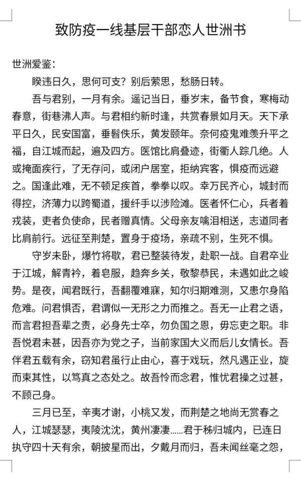 3月7日,张世洲收到女朋友向卉写给他的这篇情书,“吾与君别,一月有余……故吾怜而念君,惟忧君操之过甚,不顾己身。”书信被朋友们看到后,羡慕不已。去年大年三十深夜,张世洲连夜从老家赶回单位,在初一的早上8点便加入到疫情防控战斗中,日夜奋战,他和同事们一起,始终坚守在疫情防控一线中。