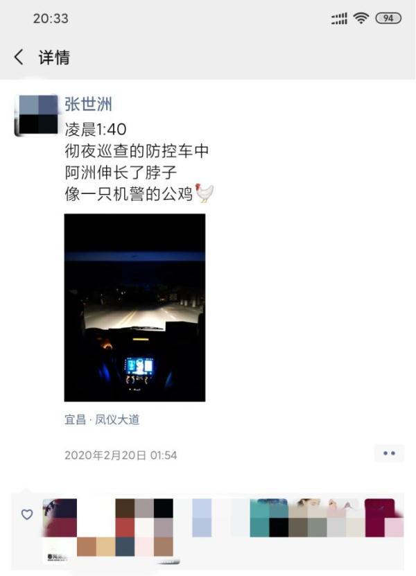 张世洲会在朋友圈记录抗疫生活。有一次,在村口执勤,面对村民的不理解,张世洲感到无奈,在朋友圈写下“不求理解,唯愿平安”。半夜守岗到凌晨,他调侃道自己是“机警的公鸡”,随时注意外面的突发情况。入户测体温时,看到居家跳广场舞的居民,他觉得很快乐,写下“为宅家的灵魂舞者点赞!”……男友从正月初一开始加入战斗已经四十多天了,没有休假,每天的工作量很大,有时还需要值夜班,俩人40多天未见面,同在一城,却像异地。向卉十分担心男友。