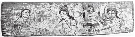 此外,于阗的丹丹乌里克遗址还出土过一块古代的木制画板,画面上有头戴高冕的妇人,手摇纺车的侍女和盛满蚕茧的篮子,其年代也为公元五世纪以前。画板的内容似乎与玄奘记载的传闻有某种联系,甚至可以说是这个故事的艺术记录。