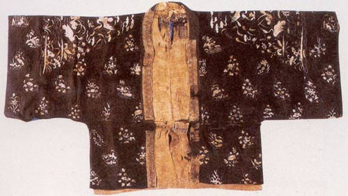 内蒙古自治区元代集宁路遗址出土的棕色罗花鸟绣夹衫,是目前所知元代刺绣服饰中最为重要的佳作。这件夹衫为对襟直领,前襟长60厘米,后背长62厘米,通长65.5厘米。袖为广袖直筒,袖长43厘米,袖口宽54厘米。该夹衫虽然为元代制品,但其形制仍具有南宋服饰的风格,与北方元墓出土的具有游牧民族风情的衣物有着很大的区别。