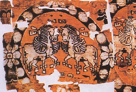 在“丝绸之路”沿途出土的北朝时期的丝绸中,不仅有精致的平纹经锦,还有不少经斜纹绮,如“套环对鸟纹绮”,“套环贵字纹绮”,不仅纹饰较汉绮复杂,而且质地更细薄透明。出土的各种五色丝线织成的织锦用色复杂,提花准确,锦面细密,质地也较薄。