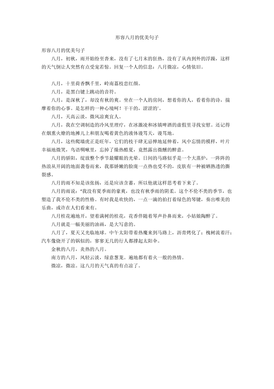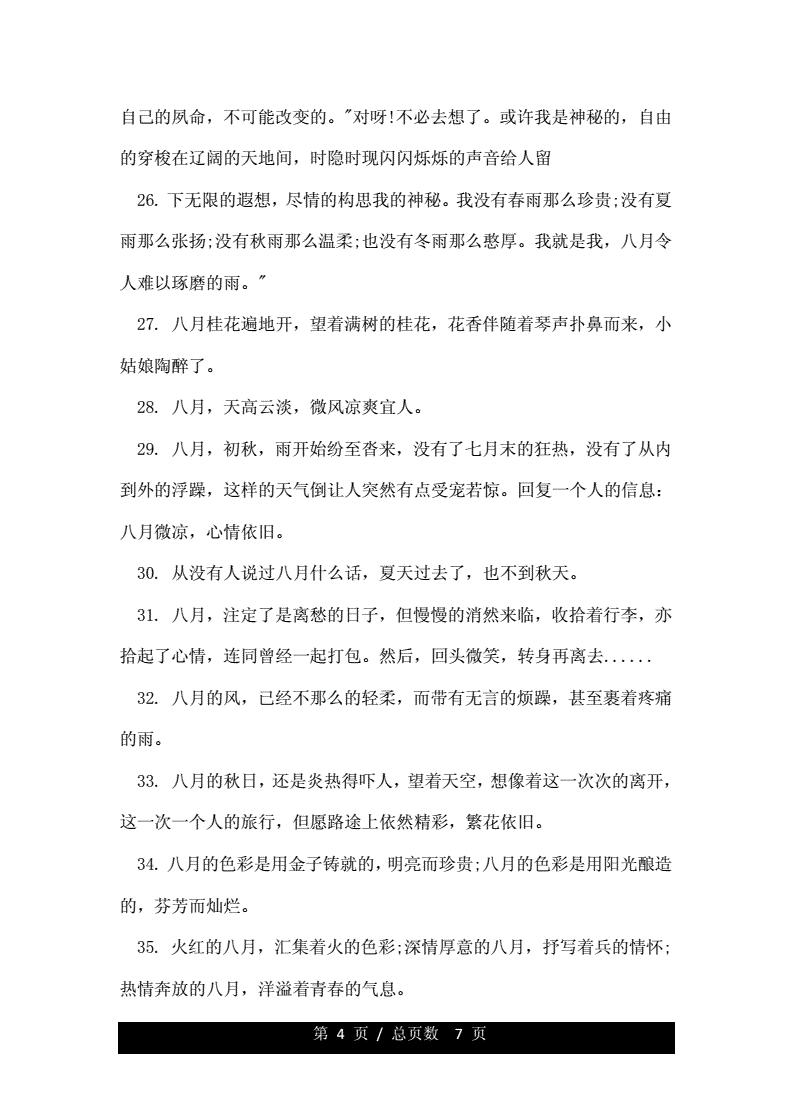 6、走进八月,你会看到八月的色彩如同阳光照耀着生命的幸福,在田野上滚动,拂动着嫩绿的禾苗,在天地间升腾,映照着洁白的云朵,叠映在忙碌的身影里,抚摩着耕耘的喜悦。