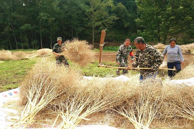 用连架拍打油菜萁我比父母多睡一会儿,但也不能睡得太久,六点左右就起床。煮上一锅粥,再将头天晚上蒸好的包子、馒头加热,送去地里给父母做早饭。父母蹲在地头的树荫下,匆匆吃上几个包子,喝下半碗粥,便又开始劳作。