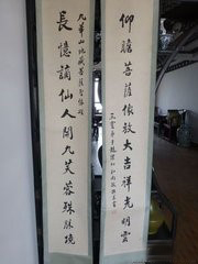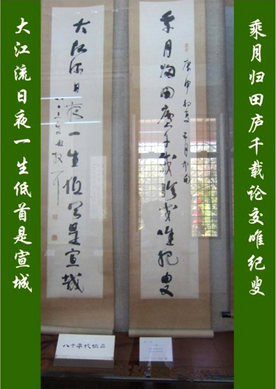 这副楹联,父亲先出下联,还引了谢眺的诗句“大江流日夜”,这是出了一个难题。楹联的下联无论题材、形式和气势要压得住全联,一锤定调。上下联必须匹配,要旗鼓相当互相呼应。父亲引用了谢眺的诗句,女儿对上联,则引了李白的诗句“乘月归田庐”。非常漂亮!这副楹联把李白与纪叟的在酒文化方面的关系,把李白与谢眺在诗歌方面隔代的师友之谊都写出来了。有形的文字后面似乎还透出无形的话外语,暗示了李白的死因?