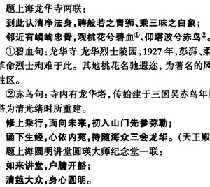 赵朴初为大雄宝殿撰写的楹联,上联仍是在叙写龙华寺历史。其中的“般若”是梵语Prajna的音译意为“终极智慧”这里指两位护法菩萨:骑青狮的文殊和骑白象的普贤。下联即是咏歌葬于龙华塔旁的革命先烈。龙华寺西有桃园,联内“观桃花兮碧血”即指此。龙华烈士中曾有诗句:“墙外桃花墙内血,一般鲜艳一般红”(见《革命烈士诗抄》)。“仰塔波兮赤乌”则是指龙华塔,又称“报恩塔”,始建于三国吴赤乌十年(247),传说孙权为报母恩而建。唐乾符、广明年间(874—881年)毁于兵燹。宋太平兴国二年(977年),吴越王钱俶重建,迄今已有千余年历史。