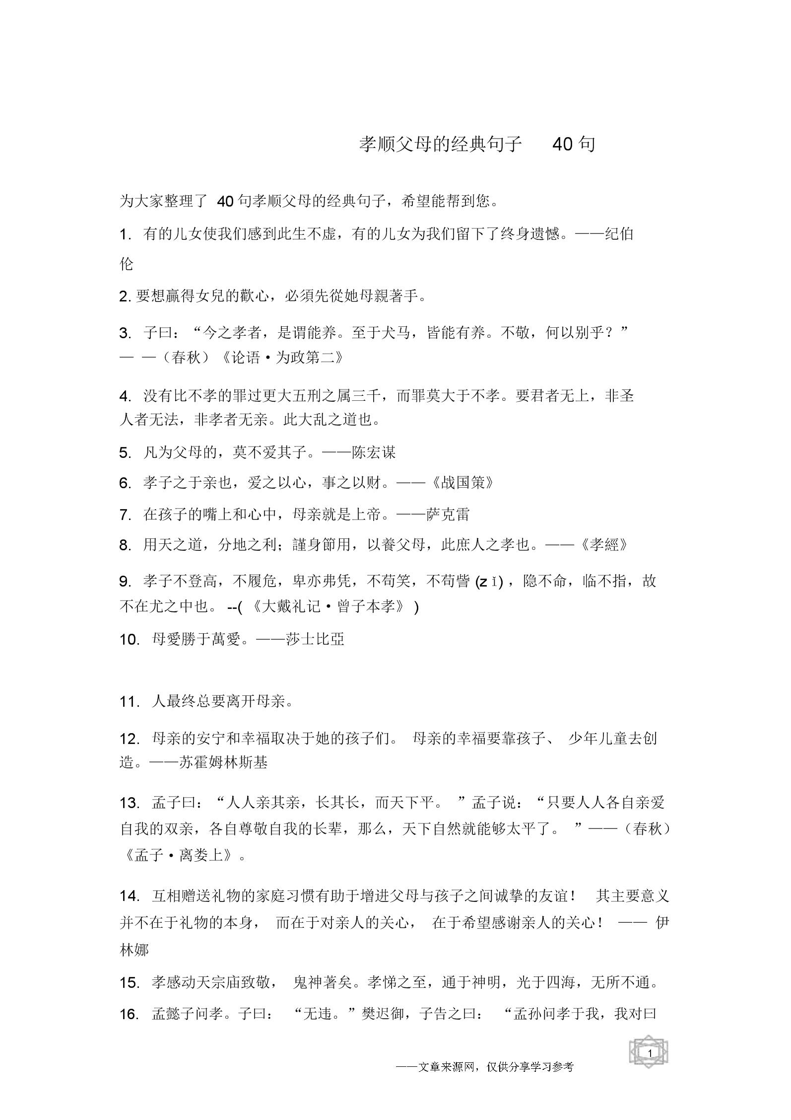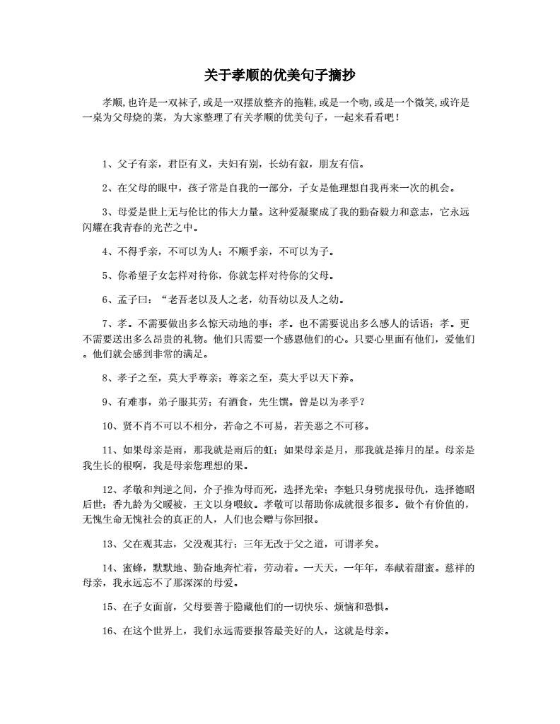 不管你现在是在努力着去实现梦想却没能拉近与梦想的距离 关于孝心的优美句子1失去了慈母便像花插在瓶子里。导读 夸女儿孝顺的句子 孝子之养也,乐其心,不违其志礼记孝有三大尊尊亲,其次弗辱,其下能养礼记父母之年,不可不知也一则。